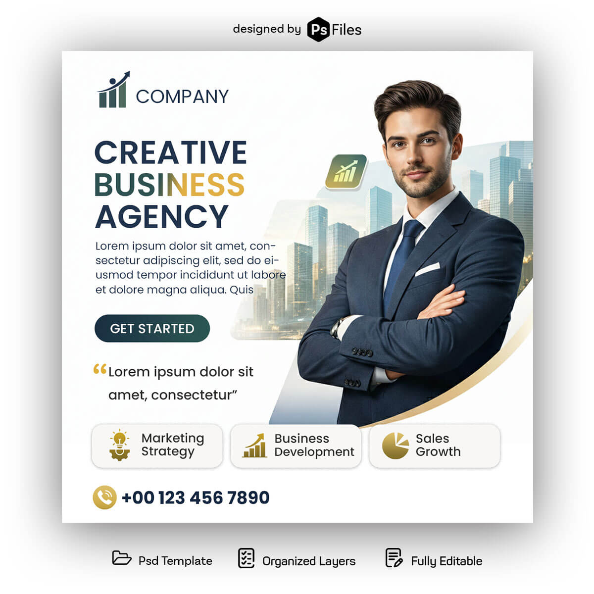 Download this Free Creative Business Agency Social Media Post Design PSD Template, a modern and professional design created for promoting marketing agencies, startups, consulting firms, and corporate services on social media platforms. This high-quality Photoshop template features a clean white layout combined with elegant gold accents, modern typography, and a stylish city background that represents professionalism and business growth. The design includes sections for marketing strategy, business development, and sales growth highlights, making it ideal for agency promotion campaigns.