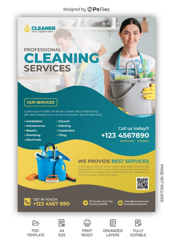 Download our new and exclusive creative flyer design PSD template for professional cleaning business services. You can use it to promote your business with this free cleaning services flyer design PSD template. You can also use this template in multipurpose advertising. This PSD template is well organized, fully layered and simple to edit. Hope you like it. Enjoy!