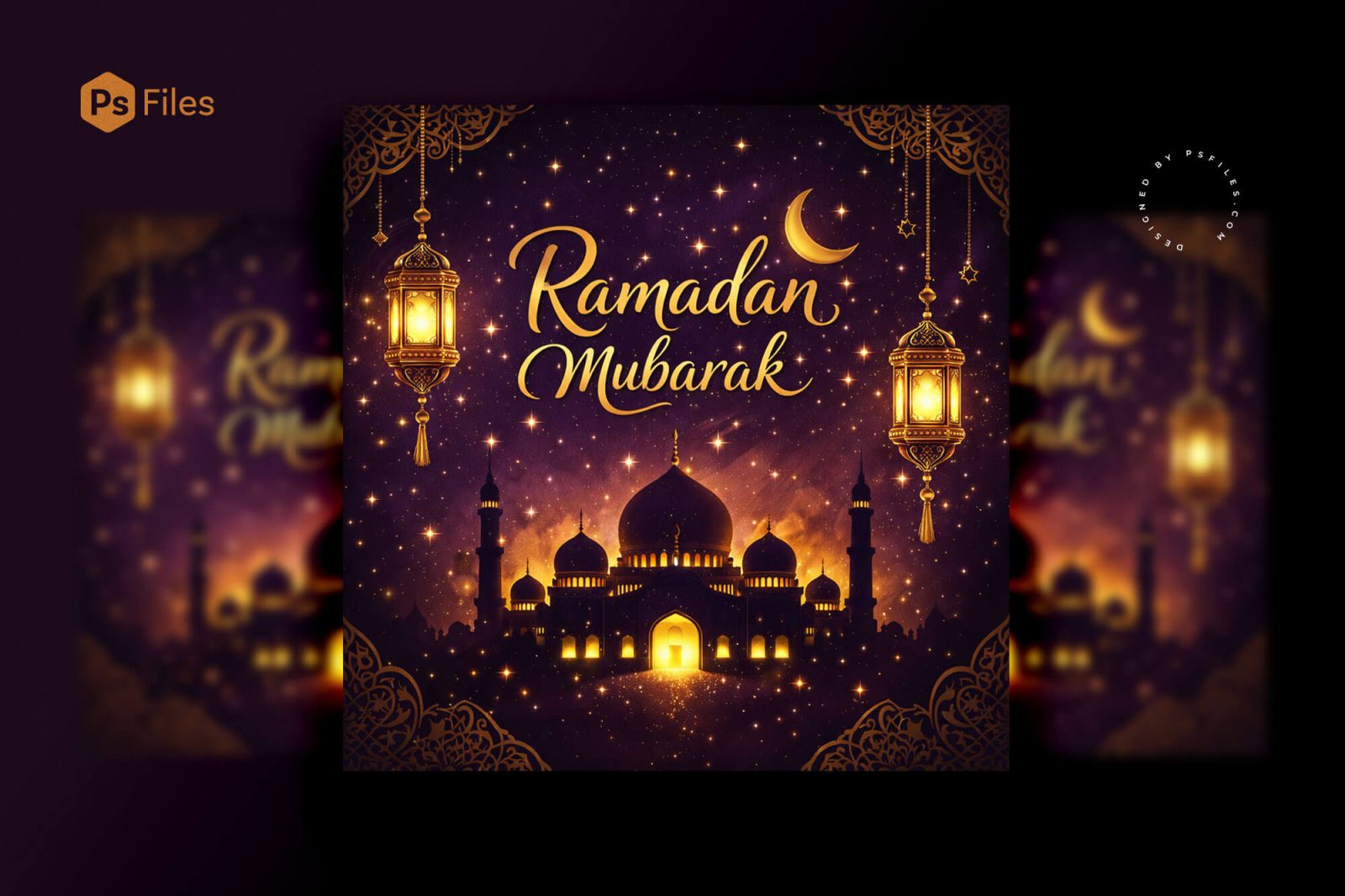 Celebrate the holy occasion with this beautifully crafted Ramadan Mubarak Eid Wishes Post Design, perfect for sharing festive greetings across social media platforms. The design features a rich night sky background filled with sparkling stars, creating a peaceful and spiritual atmosphere associated with Ramadan and Eid celebrations. At the center of the artwork, a majestic mosque silhouette glows with warm golden lighting, symbolizing faith, prayer, and the sacred spirit of the Islamic festival. Elegant lantern illustrations hang from the top corners, adding a traditional Ramadan decorative element that enhances the visual charm of the composition. The glowing crescent moon and golden calligraphy typography of “Ramadan Mubarak” further highlight the celebratory message while maintaining a refined Islamic aesthetic.