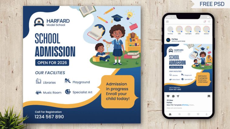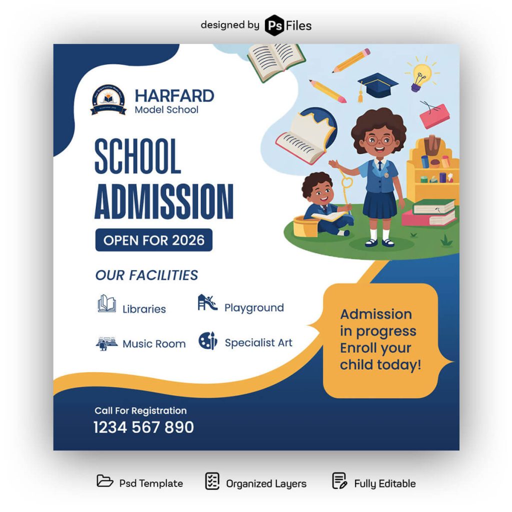 Today, we have a Free Social Media Post Design Template PSD File for Schools Admission Open Promotions. You can download zip and use our PSD file for Free. Back to School and colleges going to open so everyone will looking for a social media post promotional design. Fully layered and organized in PSD format, it allows easy customization through Smart Objects. Ideal for schools, academies, and educational campaigns, this creative banner helps communicate admission details professionally across Facebook, Instagram, and more. Download now to boost your schoolβs online visibility effectively!