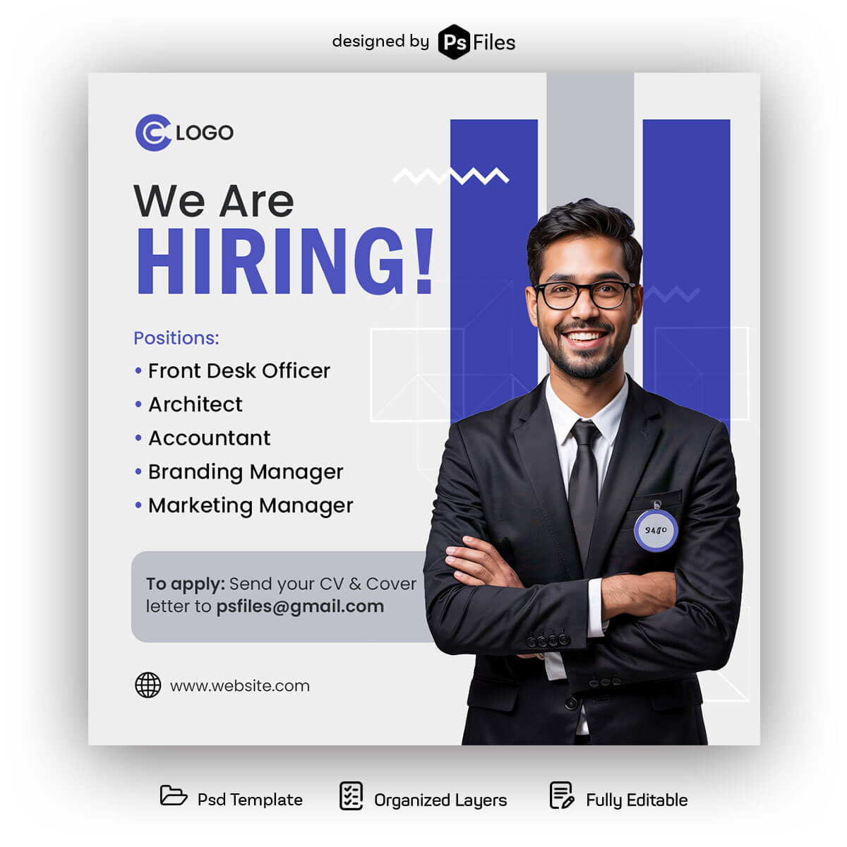 Today, we are sharing a professionally designed “We Are Hiring” social media post PSD template that’s perfect for announcing job vacancies like Front Desk Officer, Architect, Accountant, Branding Manager, and Marketing Manager. This free editable PSD is ideal for modern hiring campaigns, especially on platforms like Instagram or Facebook. Whether you’re an HR, agency, or brand, this hiring post design will attract the right talent with its clean layout and bold typography. Download now and boost your hiring visibility today!
